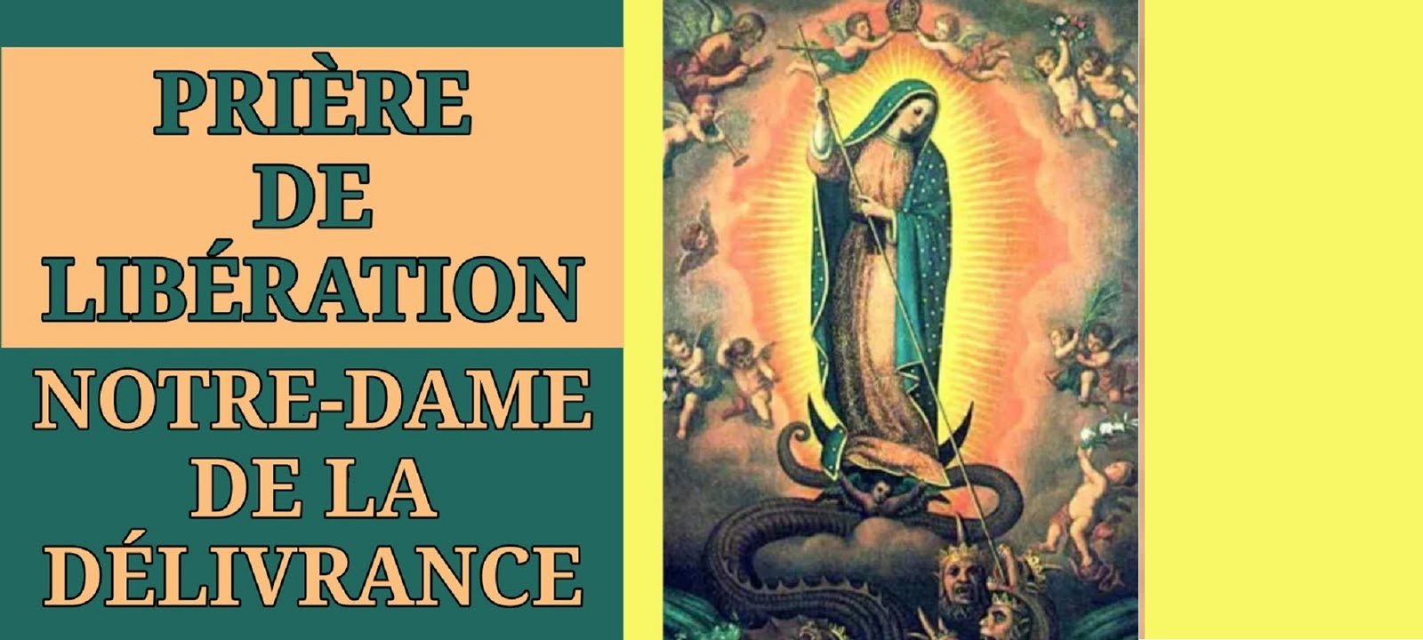 Nous Te louons, ô notre Dieu, pour ton amour, Ta miséricorde, Ta puissance, pour la Victoire du Sang de l’Agneau, de ton Fils Notre Seigneur Jésus-Christ. Nous Te louons pour notre Mère la Vierge Marie. Accorde à tous ceux qui se réfugient sous sa maternelle protection, la délivrance de maux qui les affligent, libère-les de la puissance des ténèbres, afin qu’ils vivent dans la liberté des enfants de Dieu, dans le cortège triomphal du Christ ressuscité. Amen !