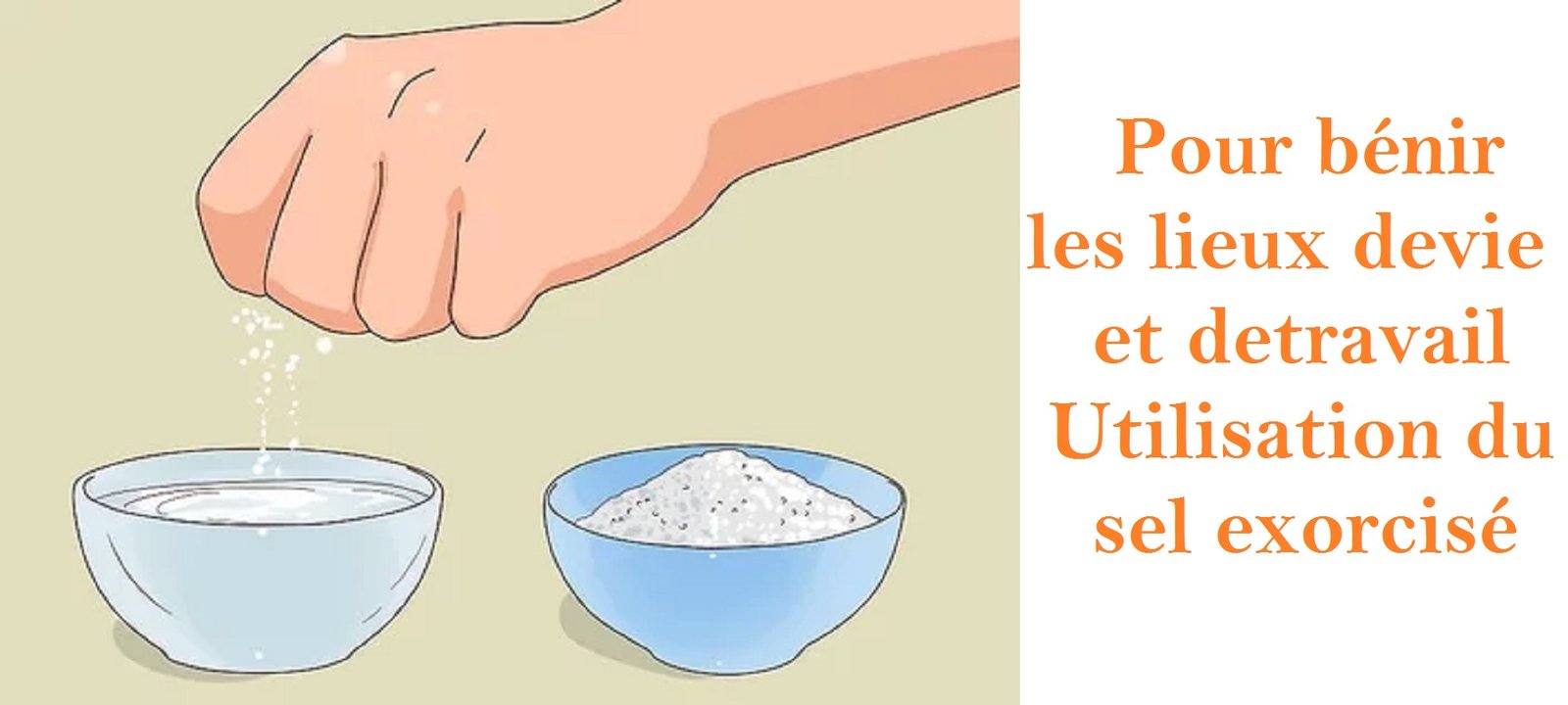Prendre un peu de ce sel dans la main et le répandre à la volé en fin grain dans toute la maison : chambre, dépendance, cours…. en récitant la prière du sel. Le geste et la prière sont simultanés et ajouter à la fin prière